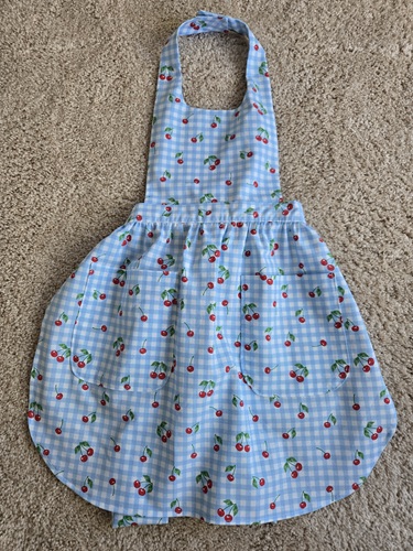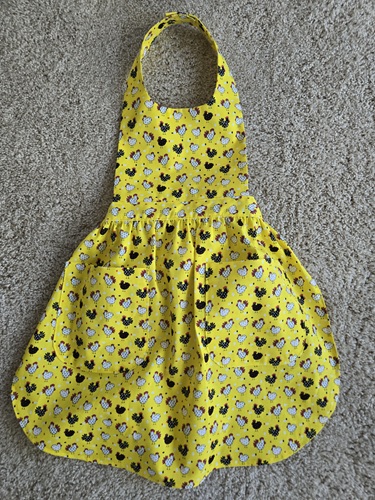 Child-size (3-4) apron with multi-colored, scattered handprints. Strap has a Velcro closure. Machine wash in cold water.
