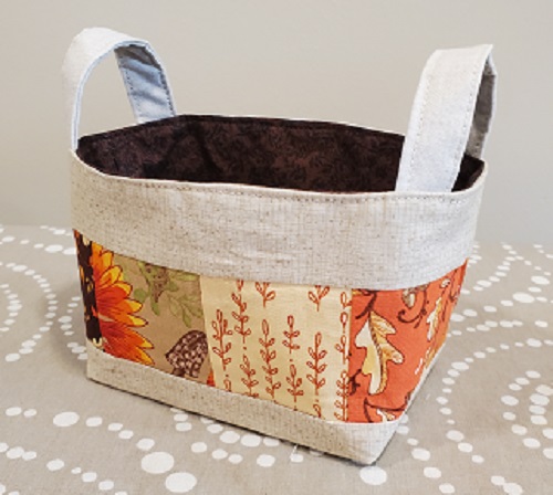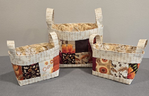 Three small baskets are made with bright fall colors and measure 6 x 4 x 3 1/2 inches. A larger basket is also available. Machine washable in cold water.