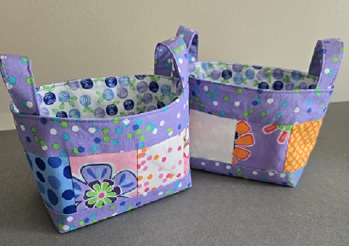 Small charm baskets made with “Fiesta” fabrics measures 6″ x 4″ x 3 1/2″.  Two available in varying prints.  Medium-size basket also available.
