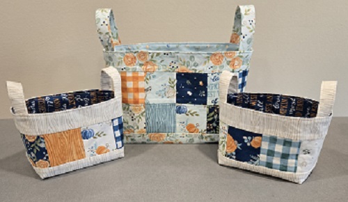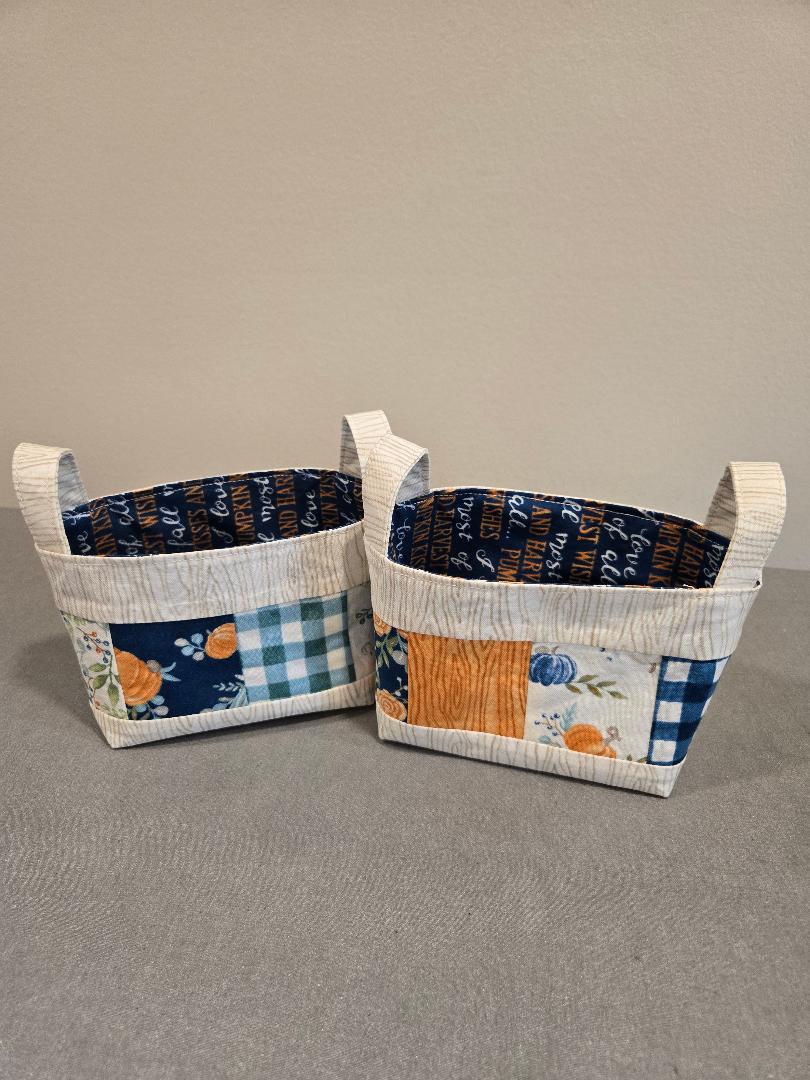 Small baskets are made with fall and harvest fabrics and measure 6″ x 4″ x 3 1/2″.  Two are available along with a matching medium-size basket.