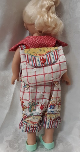 Two-piece pants outfit for 18″ doll includes matching backpack.  Machine wash cold.