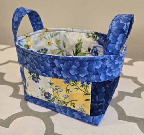 This bowl cozy is just the right size for a loaf pan in neutral colors with a touch of blue. Machine wash in cold water. Do not use in oven.