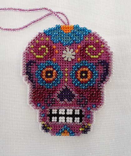 Cross-stitched & beaded orange sugar skull with peace symbol embellishment to use as magnet or ornament. Green and rose sugar skulls also available.