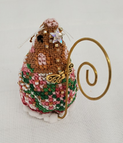 Cross-stitched and beaded Christmas mouse atop a layer of icing with gold wings on her back. She’s holding a star embellishment and has a curly gold tail that can be used as a hanger. Her Pink Cube is also available for her to sit atop. She’s a petite 2 3/4″ tall.