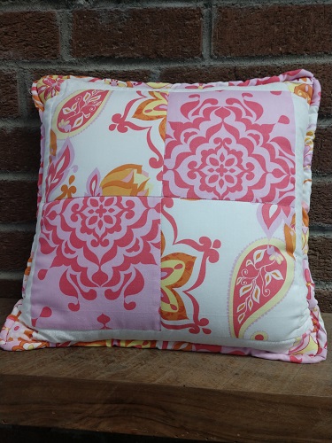 12″ pillow in pink prints with a Log Cabin block in the center of the front.