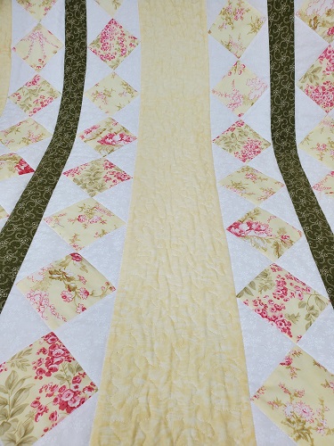 This lovely quilt is made with pastel floral fabric with green accents.