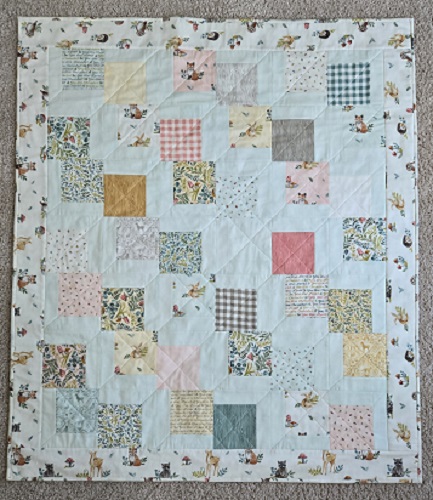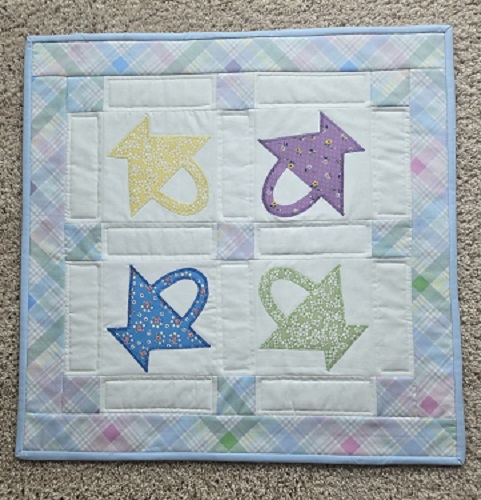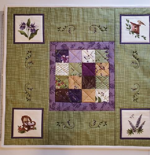 Table runner is made with material that looks like shirt fabrics with a yellow border and gray edging.  Measures 45″ x 12″.  Machine wash in cold water.